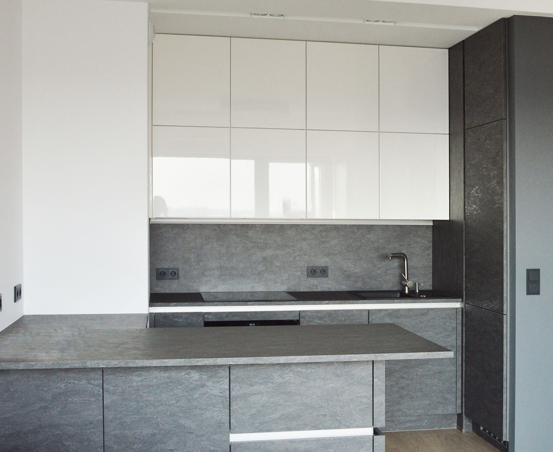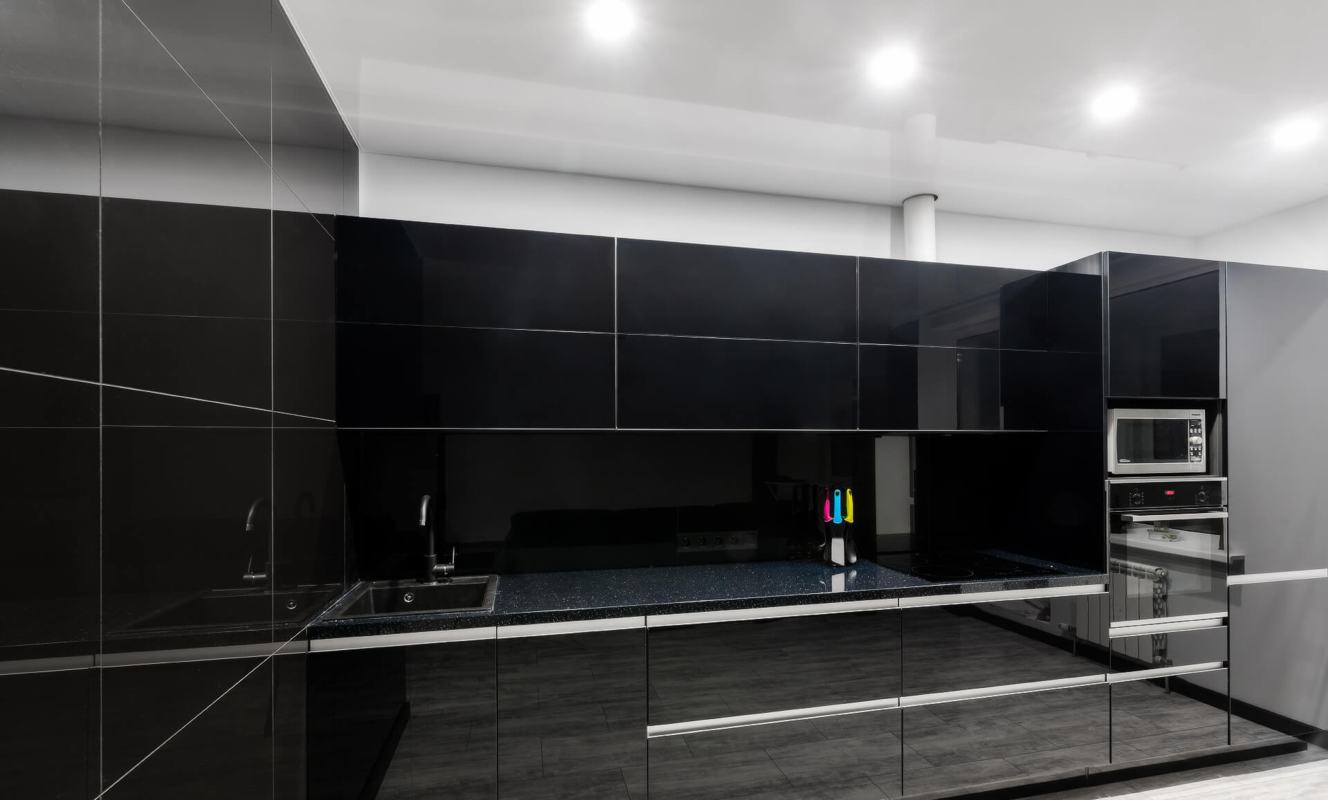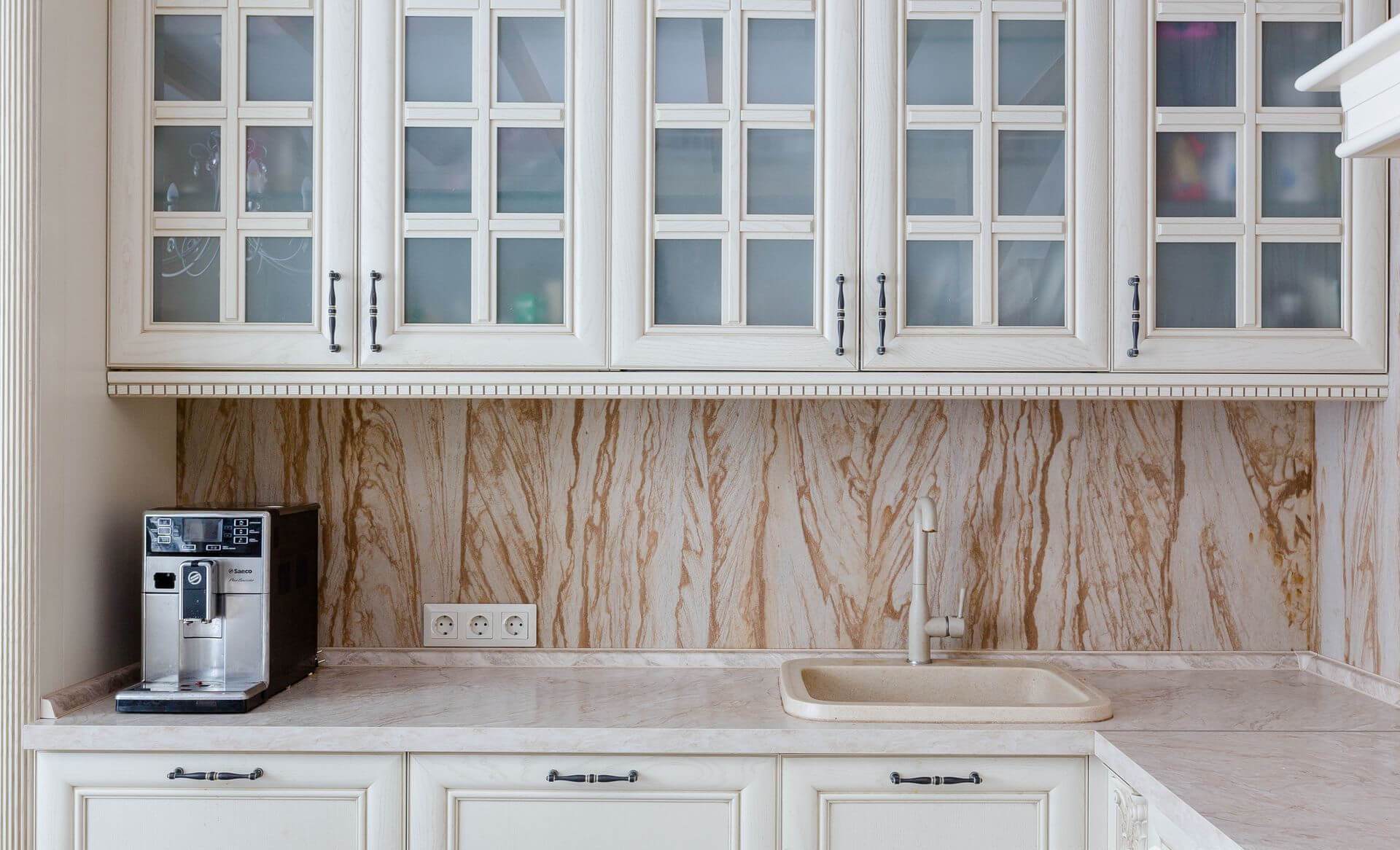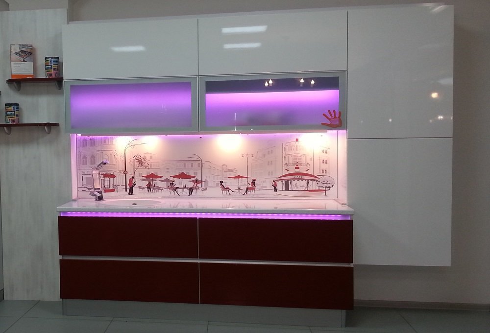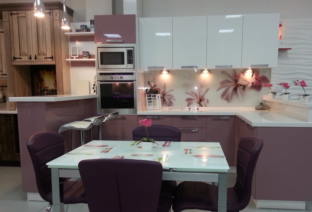 Выбрать из большого ассортимента образцы кухонных фасадов, корпусных деталей, столешниц, фартуков, смесителей, ручек (при необходимости);